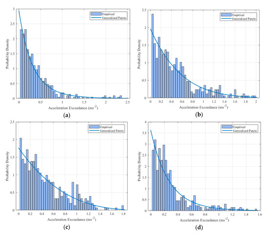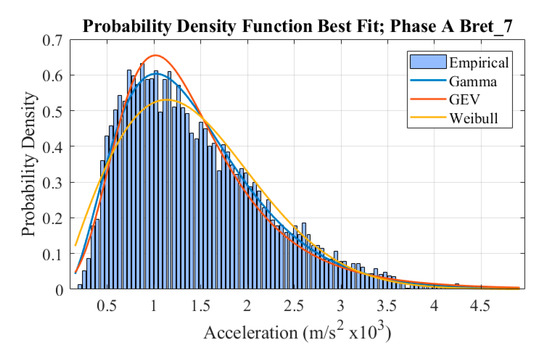 The gamma, GEV, and Weibull distribution fits to the measured acceleration responses were compared in this paper, and Figure 14 provides an example of such a comparison.