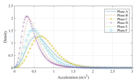 A probability distribution fit to observed data can often be a meaningful marker [59,60,61] for assessing various changes of damage conditions as compared to individual comparison of percentiles. Multiple distributions were considered for this data in this regard. A gamma distribution [62] was found an appropriate model for acceleration responses from an experimental model under irregular wave forcing. The probability density function (PDF) for gamma distribution for a random variable x is