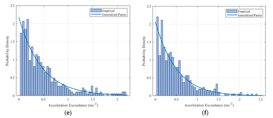 Generalised Pareto probability density function (PDF) fits to acceleration exceedance data from Bret 7 wave tests, for (a) Phase A; (b) Phase B; (c) Phase C; (d) Phase D; (e) Phase E and (f) Phase F.