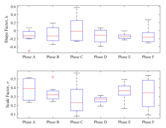 Table 8 presents the GP distribution parameter values for various phases of testing, and the percentage difference of this value from Phase A. The shape factor (k) changes most significantly between phases. From an undamaged state, k decreases for all but phase F of testing, where it increases by 103.3%.