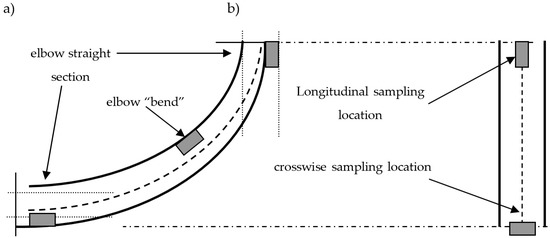 Figure 1. Steam pipe elbow: (a) area of sampling; (b) sample location method- Elbow “bend” on the side of maximum bending zone (compression or stretching);
