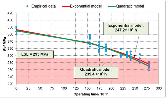 - Modified exponential:which—because the course of changes in mechanical properties is “inversely proportional” to the exponential model—better reflects the occurring changes in properties during the operation of pipe elbows,
