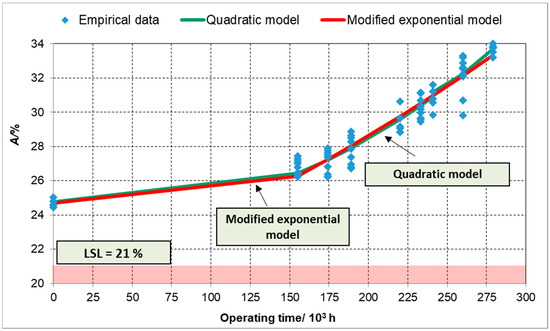 3.3. Determining the Forecast of Operating Time on the Statistical Results of Elongation (A) Change