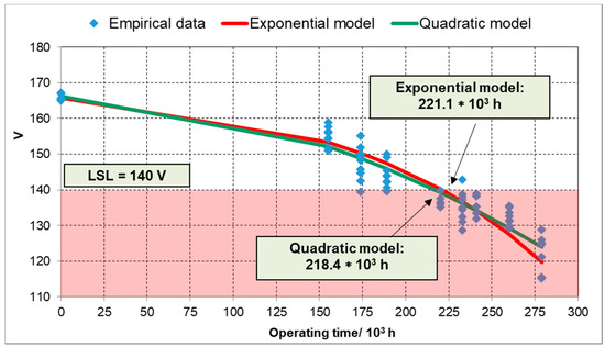 3.4. Determining the Forecast of Operating Time on the Statistical Results of Vickers Hardness Change