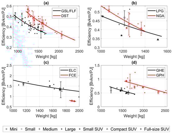 Efficiency trends as a function of vehicle weight for gasoline, flex-fuel and diesel cars/light trucks (a), for LPG and natural gas cars/light trucks (b), for fully electric and fuel cell cars/light trucks (c) and for gasoline–electric hybrid and gasoline–plug-in electric hybrid cars/light trucks (d), respectively: data-points represent the collected efficiency data, while the different size categories (Mini, Small, Medium, Large, Small SUV, Compact SUV and Full-Size SUV) are represented by the mean values of their respective weight-efficiency couple.