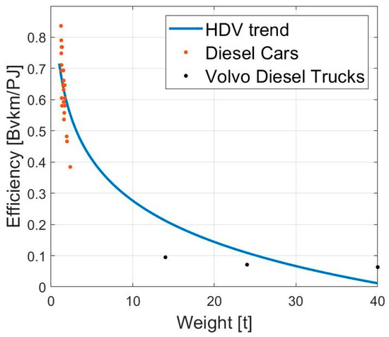 For HDVs (trucks and buses), an official document by Volvo Trucks [23] states guide values for the fuel consumption of their diesel trucks. Based on such data, and merging them with those for diesel LDVs, a new efficiency trend for HDVs is calculated, as reported in Equation (7) and displayed in Figure 2.