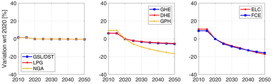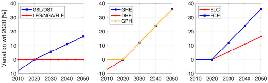 The evolution of the efficiency over the time horizon analyzed in the present paper is assigned exogenously, keeping, for reference, the values assigned in the JRC-EU TIMES [11] for European LDVs, based on recent market trends. In JRC-EU TIMES, the fully electric LDVs are subdivided into three categories according to their battery size (), due to the fact that the vehicle demand is subdivided into long and short distance, making some technologies suited for a specific demand category. The evolutions assigned to battery-electric vehicles (BEVs) have been taken into account for ETM fully electric LDVs. The efficiency variations, with respect to the 2020 values adopted in the present analysis, are represented in Figure 3: the same ratios for such parameters, between the characteristics of present and future technologies as in the JRC-EU TIMES, have been applied throughout the ETM timescale. From 2050 onwards, all efficiencies are kept constant until the end of the timescale, due to the lack of reliable estimations. Note that, as in JRC-TIMES, the efficiency has been considered constant for HDVs during the entire time horizon that we consider, mainly due to the poor amount of literature available.
