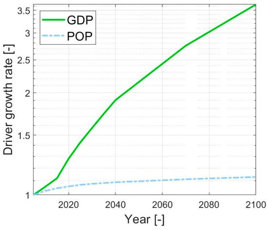 where is the demand, the demand sector, the region, the time step and the counter for time steps; is the driver growth factor, which is a function of the demand sector, region and time, while is the elasticity, see Figure 6, that also changes with the storyline .