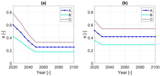 The elasticities of demand are considered in ETM, in order to reflect changing patterns in energy service demands in relation to socio-economic growth. These are yearly variables, different for each demand category and region, but generally allocated on three levels, according to the selected storyline, as shown in Figure 6. Conservatively, the elasticity is assumed not to decrease further in the long term, to avoid an excess of optimism about the growth of future demand. Note that the literature on the specific hypotheses made for elasticities of energy service demands is extremely poor, so they are constantly verified and updated, according to up-to-date statistics, to reflect changing patterns in the use of energy. Since the demand for transportation energy services in Europe is driven in ETM by constantly growing drivers, elasticities are kept constant from a certain time step onwards in order to reflect the saturation of the related energy service demand, which could ease the energy transition to a low-carbon system [30]. Indeed, in the most environmentally friendly storylines, A and B, the levels of elasticities are kept lower than in storyline C.