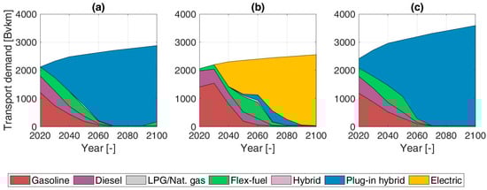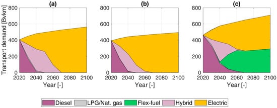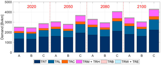 According to Equation (9), the total road transport demand follows the trends illustrated in Figure 7 for the different storylines, during the ETM time horizon. In general, as visible from Figure 7, the road transport demand follows an increasing behavior, at different rates, for the three storylines, with cars (TRT) always keeping the highest share. As a general remark, the assigned values of elasticities are functional in relation to the reduction in the growth rate of demand with respect to the associated driver. In the specific case of road transportation demand, scenarios from the IEA Energy Technology Perspectives 2017 [15] highlight a plateau in the growth of the vehicle fleet until 2060, which is reflected here.