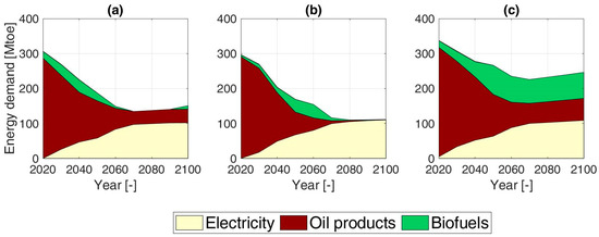 The effects of the new road transport module bring a somehow comparable road transport energy demand trend for storylines A and B, as reported in Figure 8a,b. Indeed, a significant penetration of electricity is visible in both storylines: up to (Storyline A) and (Storyline B) of the total energy consumption in 2050, and (Storyline A) and (Storyline B), in 2100, significantly reducing the reliance on oil products, as expected. Apart from the demand, which is increasing less in terms of for storyline B, if compared to A (see Figure 7), which leads to a lower energy demand, as both storylines A and B strongly reflect their environmentally friendly footprint.