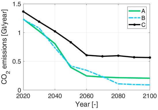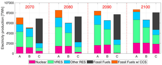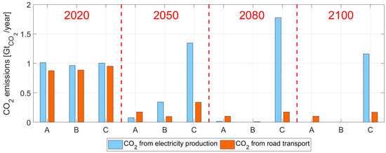 As a consequence of the large uptake of electric vehicles, reflecting in good performances from the three storylines to lower emissions from road transport (see Figure 12), the response from the electricity production system to bear this abrupt change should be analyzed. Figure 13 represents the comparison between emission levels from both electricity production and road transport systems. While, at the first selected time step (2020), such levels are almost the same, the evolution in time highlights how, in the environmentally friendly storylines A and B—driven by RCP 2.6—the adaptation of the electricity production system to the uptake of electrified transport solutions is quite effective already, starting from 2050: thanks to the strong impact of renewable sources and the implementation of CCS in electricity production (mostly in storyline A, where the higher electricity demand cannot be fully sustained by renewable sources), net zero emissions are not reached until 2100. A stricter relationship between emissions from the two sectors is highlighted in storyline C, where the increase in electricity demand from road vehicles corresponds to a direct increase in emissions from electricity production, due to the additional fossil fuel-based capacity installed to cope with the higher electricity demand. Almost the same combined quantity of emissions in 2020 is preserved until 2080. At the very end of the century, instead, RCP 6 prescribes a last-minute attempt to lower emission levels; thus, a larger uptake of nuclear, coupled with a reduction in fossil fuel-based production (see Figure 11) contributes to cut emissions from electricity production.