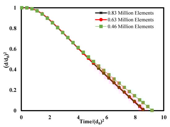The result of the present model is close to the experimental work in Chauveau et al. [34] as compared with the numerical model of Abramzon and Sirignano [35]. This may be because of the fact that, in the present model, turbulence effects are taken into account by applying a realizable k-epsilon model, and this is the reason for obtaining the results closer to the experimental work. Another reason is, in the experiment of Chauveau et al. [34], the droplet was at room temperature initially and droplet regression was recorded when the droplet was already heated in the furnace. For this reason, the heat-up period of droplet was ignored and only the evaporation characteristic was recorded. The difference between the present model and the experiment of Chauveau et al. [34] is also owing to this heat-up period. Furthermore, all experimental measurements are subject to some uncertainty. Therefore, the numerical results are not expected to exactly match the experimental results. The absolute error was calculated for the present model when compared with the experimental model [34]. The absolute error was found to be 0.9238, which is acceptable as the error is less than 1. In the real phenomena, turbulence effects are present and cannot be ignored while performing CFD computations. The model validation shown in Figure 3 is for the diesel fuel. The model predicts the evaporation rate in a good agreement with the experimental and numerical results. As the current model predicts the correct evaporation rate of diesel fuel droplet, it can be applied to the biodiesel fuel because the properties of both fuels are similar in a number of ways. For example, properties like vaporization temperature, volatile component fraction, and saturation vapor pressure are exactly the same. Some other properties of both fuels differ that make the composition of fuels different and their behavior under the same operating conditions. Thus, we can extend the model validation to both fuels.