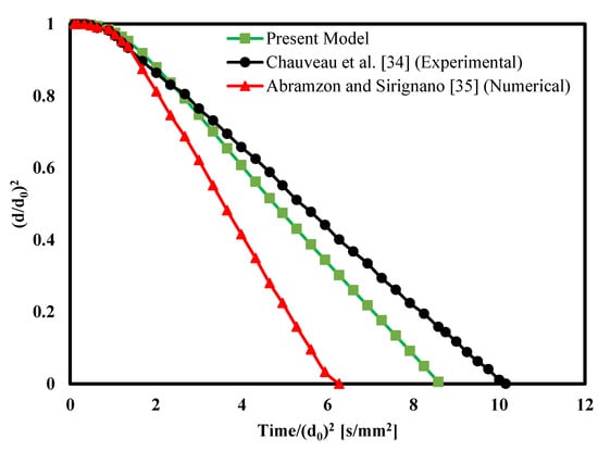 As shown in Figure 3, the results include the droplet lifetime with respect to the normalized time. The profile of regression in the droplet lifetime of diesel fuel is compared with the available experimental and numerical data.