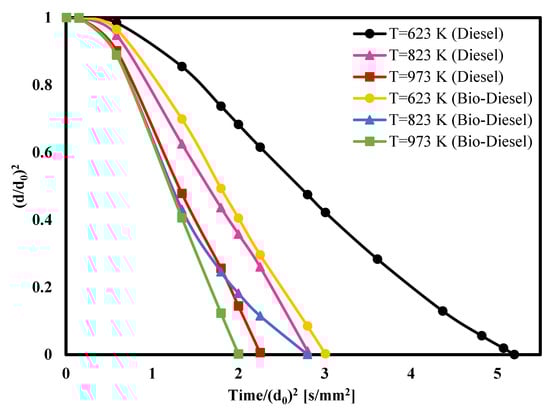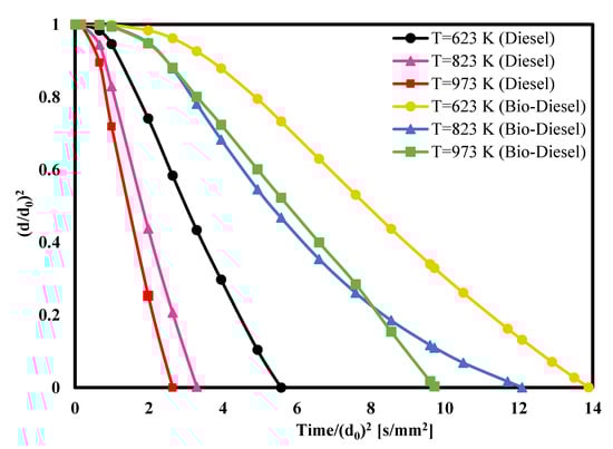 In Figure 4, the profiles of reduction in diameter of 20-micron droplets of diesel and biodiesel are plotted at three different temperatures. Regression in diameter is plotted using the classical D2 law. Normalized diameter is plotted against the normalized time. At an ambient temperature of 623 K, biodiesel droplets take the maximum time to evaporate completely. The life of the droplet is extended owing to low ambient temperature. Another reason the biodiesel droplet takes longer to fully evaporate is that the boiling point of biodiesel is much higher than that of the n-decane diesel fuel. As stated in Table 2, the boiling point of biodiesel is 669.91 K and that of diesel is 477.10 K. Thus, at the low ambient temperature of 623 K, biodiesel droplets take more time to evaporate than the diesel fuel droplet. At the temperature of 823 K, both biodiesel and diesel fuel droplets fully evaporate earlier than the droplet temperature of 623 K. The effect of increasing temperature has shortened the lifetime of diesel fuel droplet more than as compared with the biodiesel that is evident from Figure 4. Finally, at the temperature of 973 K, the droplet lifetime becomes smaller as compared with previous cases. At this high temperature of 973 K, the lifetime of both diesel fuel and biodiesel droplets is too short as compared with the lower temperatures of 623 and 823 K.