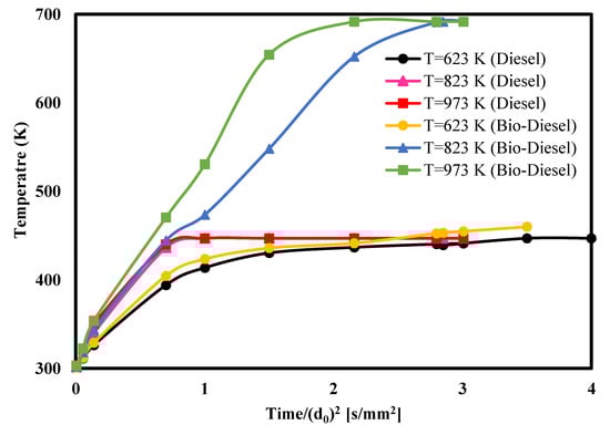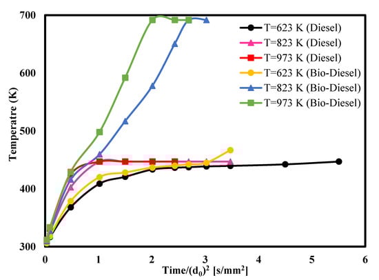 In Figure 7, the temperature profiles of 25-micron droplets are plotted against the normalized time. The same trend is observed for the different ambient temperatures. For a lower temperature, the droplet of larger diameter evaporates in a large time as compared with the higher temperatures. The residence time of biodiesel droplets is lower than the residence time of diesel fuel droplets, thus leading to the complete evaporation of fuel and, ultimately, complete combustion to produce more power and high thermal efficiency.