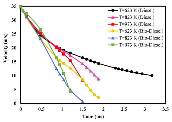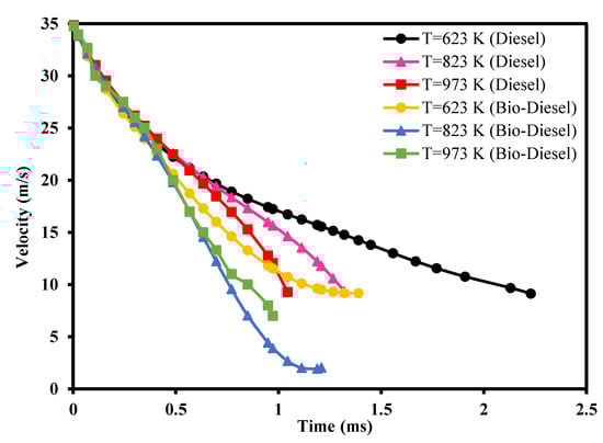 In Figure 9, the velocity profiles of the 25-micron diameter are plotted at various ambient temperatures. Velocity decreases in the same way as for the 20-micron droplet. However, one noticeable thing is that, for 823 K, the velocity of the biodiesel fuel droplet has become almost zero, which might be owing to the kinetic energy force of the particle being balanced with the drag force. The velocity is also decreased for 623 K and 973 K as compared with the 20-micron droplet. In the case of the diesel fuel droplet, the velocity profiles exhibit almost the same trend for both 20 and 25-micron droplets. One important thing that is observed is that as the size of the droplet is increased and its residence time is also increased. Larger droplets need more time to evaporate completely and smaller droplets need a short amount of time.