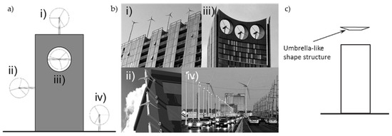 (a,b) Wind turbine (WT) and buildings: (i) on rooftop, (ii) on façade, (iii) integrated, (iv) in vicinity; (c) flow enhancer [17].