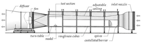 Wind tunnel tests have been conducted at the Atmospheric Boundary Layer (ABL) Wind Tunnel Lab of the Ruhr-Universität Bochum (RUB, Germany), with a cross section of and a length of , and an open tunnel configuration with the fan downstream of the test section.