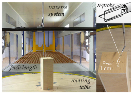 Figure 2 shows that the ABL is simulated thanks to turbulence generating spires and a castellated barrier, and roughness cubes (from 3.6 cm to 1.6 cm) capable of generating a broad variety of atmospheric boundary layer profiles. Measurements of the flow pattern were taken above the rooftop, using hot-wire anemometry (HWA). A miniature -wire probe of the DANTEC 55P61 kind has been placed at different heights above the model rooftop, using a traverse system. Figure 3 shows a configuration for the high-rise building model implemented in this study, with a detail of the HWA probe. The probe could not be positioned for distances smaller than due to the fact that HWA do not account for reverse flow.
