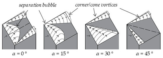 Expected flow patterns at the flow region for the different angles of attack. The approximate topology of cone vortices and separation bubbles is indicated along with the direction of the wind speed, as per previous numerical results [30,32,35].