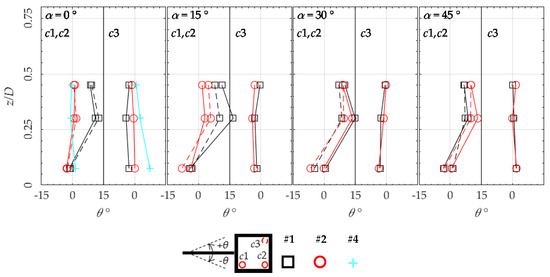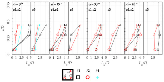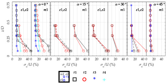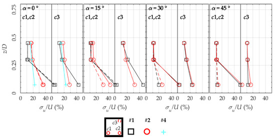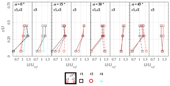 Figure 7 shows the normalised mean wind speed U/Uref as measured over positions c1, c2 and c3. Position c1 is dashed in the figure due to the symmetry of the wind direction. For α = 0° and , in isolated building configurations (configuration #1 from Table 1), the flow is likely to be separated close to the roof, analogously for the windward and leeward corners, with hot-wire anemometer returning lower wind speeds and high turbulence intensities >30% than those found at higher z/D. At the other wind directions closer to the roof, a marked difference between the two windward corners is noticeable, compatibly with the expected flow pattern for the different wind directions (Figure 6).