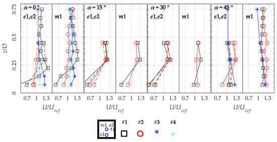 Buildings in clusters (configurations #2) do not differ significantly at and α = 45°, while the behaviour is markedly different for the other angles. This is compatible with the arrangement of dummy buildings, leaving a portion of undisturbed flow at those wind directions. Nevertheless, at , the disturbance of upstream buildings causes a reduction in wind speed at higher quotes from U/Uref ~1.3 of the isolated case to ~1 of clustering. However, the wind speed closer to the roof is improved in clusters for all affected wind directions, with a normalised wind speed of ~0.8 at α ≤ 15°, while for other wind directions an acceleration of ~1.3 takes place for shown configurations.