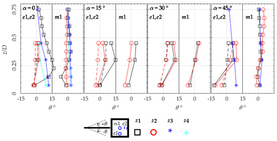 Mean skew angle at windward and leeward edges (e1,e2), and centre location (m1). Symbols as indicated in the legend, for configurations #1, #2, #3, and #4 and the four wind directions. Positive values for nose-up skew direction.