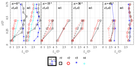 Figure 14 shows the edge and centre locations. For configuration #1, the length scale gradually increases towards Lref up to z/D~0.2, to then maintain that value at other heights for all wind directions. Configuration #2 shows a different behaviour to #1 at α = 0°, with a sensibly smaller length scale (comparable to Lref/2 instead of Lref, which might indicate a larger extent of the separated flow region [32]). For the centre location of configuration #1, the behaviour is different between α = 0° and the other directions. For α = 0°, Lu increases steadily towards Lref up to z/D~0.3–0.4, while for the other wind directions Lu increases in a similar manner for both configurations #1 and #2. At α = 45° the length scale shows similar values at both lower and higher quotes, showing the effect of the cone vortices and the relatively undisturbed flow region at the centre of the roof. The docked roof configurations #3 and #4 show a reduction of the length scale similar to configuration #2 at α = 0°, and larger uniform values at α = 45° for configuration #3.