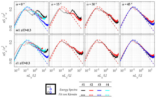 To further compare the behaviour of the roof flow region with the atmospheric wind, Figure 15 shows the power spectral densities for the windward edge e1 and centre m1 locations (respectively, upper and lower rows) at z/D = 0.3 or z = 12 m for the various configurations and wind directions as indicated. The von Karman Spectrum, as calculated using the integral length scale Lu, is also computed and plotted together with the results. U is the mean wind speed, n is the frequency in Hz and the wind speed variance. Results are consistent with findings of Figure 13 and Figure 14, with the different configurations diverging from the von Karman spectrum at α = 0° (Figure 15).