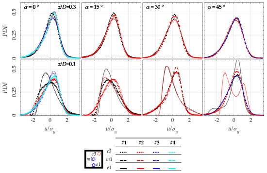At α = 45° the PDF is analogous to higher quotes, with the exception of configuration #1 which show still a negative skewness with positive fat tails. At z/D = 0.3 the distribution is analogous at all configurations and locations, with positive skewness and negative fat tails. In all cases and quotes the docked roof configurations show an analogous wind distribution, normalising the behaviour.