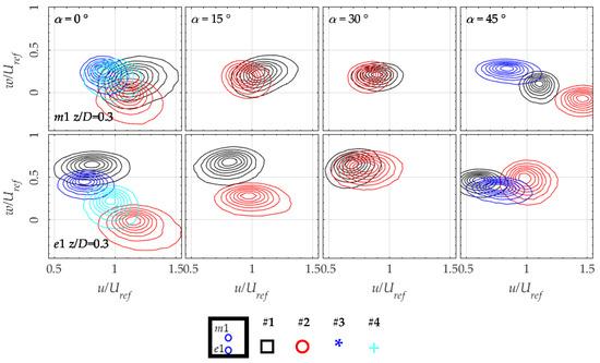 The joint probability distribution function (JPDF) can be useful to understand the physics of a turbulent flow in terms of dominance of a wind component with respect to the other. Figure 17 shows the JPDF for locations e1 and m1 at z/D = 0.3. For α = 0°, the mean wind speeds of all configurations are comparable to Uref for building clusters, and they slightly differ for the isolated building at both positions. The main difference is the vertical component, which is ~0 for configuration #2 and ~0.75 for configuration #1 showing the large variability of skewed angle. The horizontal spread of the contour plot signifies a lack of variability of the vertical wind component, and it is significant that configuration #4 shows the largest variability of w. In the centre position m1, all contours insist on the origin of the plot at α < 45°, meaning that a similar mean wind speed is present in different configurations. However, the variability of w is enhanced, showing the unsteady behaviour of the shear layer above the reattachment region of the roof.