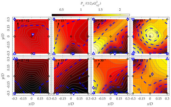 Figure 18 also shows contour lines for the turbulence intensity at z/D = 0.1. All over the roof the turbulence intensity has values around 30%. The worst wind directions are those which cause a separation bubble to occur, i.e., α = 0° and 15°. At α = 45°, the corners at the transversal diagonal of the building perimeter yield the lowest energy, with a decrease in power of , while on the other diagonal an increment of >100% occurs. This is telling towards positioning strategies. If high values for the turbulence intensity are somehow accepted, a good approach to implement urban wind energy at low heights can be the installation of multiple small devices at all corners of the roof. In this way, devices in suitable locations make up for the reduced power of other locations. In fact, at this height, the best values are measured at corners in all wind directions. The worst performing locations are the edges of the building, which should be avoided due to both the low energy and the high turbulence. The centre of the roof has instead a good yield, on the same order of magnitude of the undisturbed power. When the building is isolated in configuration #1, the energy yield is in general not favourable as if the wind direction is α = 0° or 15°, or if a separation bubble is present. Cone vortices are found to be less turbulent and for α = 30° and 45° an energy gain is noticeable, with the isolated model and the clustered one behaving similarly.