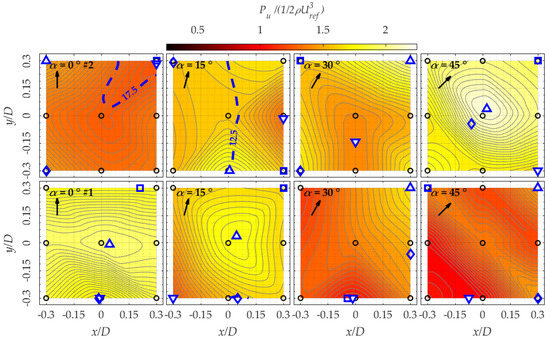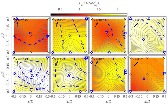 Figure 18 shows Pu at z/D = 0.1. This height corresponds to common locations where a small wind turbine might be installed in the built environment. Pu is normalised against the wind power as calculated using Uref, or the power which would be available in the absence of the building. Configuration #2 (top row) shows that in general a cluster of buildings benefits the energy available at lower height compared to the isolated building configuration. The windward corner is the region where most power is to be harvested, with an increment of harvestable energy up to ~+50% at α = 45°.
