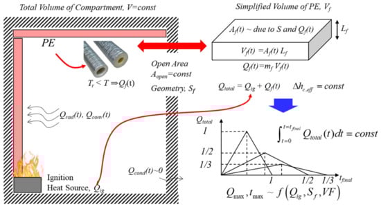 where FIGRA refers to a main parameter to evaluate the fire-retardant grade. As Qig increases, is varied in proportion, since the size of the solid surface to reach the reference temperature (Tr) varies with the combustion time. However, when the heat of combustion (Δhc) in Equation (4) maintains a constant value with a fixed value of Δmf, the integral value of Qf(t) during the total combustion time should satisfy the first law of energy conservation. It means that Qmax increases as the total combustion time decreases, as shown in the lower right side in Figure 1. Especially, the convective and radiative heat can be mainly affected by the compartment space (VM), the volume of the combustibles (Vf), and the geometrical shape of the opening area. Therefore, it is assumed that and tmax can be functioned with the quantity of the volume of the compartment (VM), the volume of the combustibles (Vf), and the ignition heat source (Qig) as denoted in Equation (6).