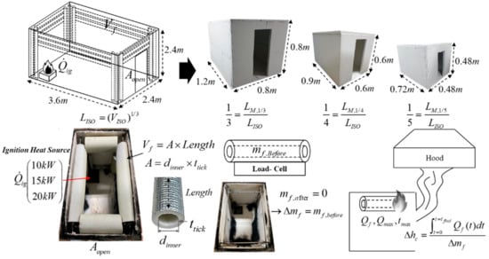 where Sf, VM, VISO, Vf, and VF are the scale factor, the volume of the compartment, the volume of the ISO 20632 compartment, and the volume fraction of the pipe insulation, respectively. The schematic diagram and pictures of the experiment conditions are explained in Figure 2.