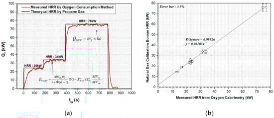 (a) Calibration results of heat release rate (HRR) using propane burner and (b) comparison of the theoretical and measured HRR.