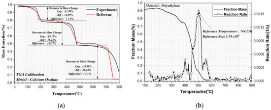 Figure 4a shows the measurement of the mass loss rate of the standard specimen calcium oxalate to verify the accuracy of the apparatus of thermo gravimetric analysis (TGA, Model STA PT1000). The calcium oxalate changes in the symmetry of CaC2O4∙H2O, CaC2O4, and CaCO3 as mentioned in reference []. Thus, the reference temperature (Tr) was given as 190 °C, 450 °C, and 700 °C at ±30 °C, and the mass reduction rate was measured as −12.99%, −19.15%, and −29.98%, respectively. The measured values were in good agreement within about ±0.6% to the reference values.