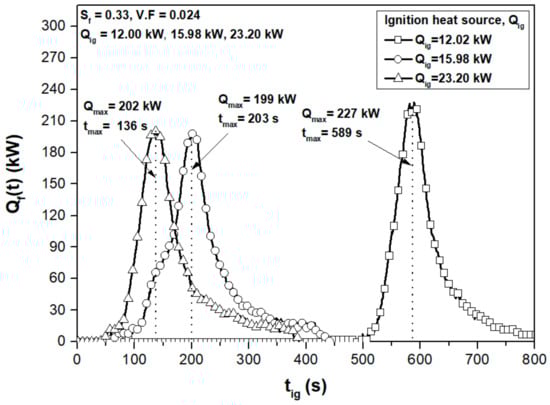 The effects of the ignition heat source on the heat release rate in the case of the fixed values of the scale factor (Sf = 1/3) and the volume fraction (VF = 0.024) are plotted in Figure 5. As denoted in this figure, the values of tmax were decreased as 589 s, 203 s, and 136 s in accordance with Qig = 12 kW, 16 kW, and 23 kW, respectively. While Qmax maintained a constant value at approximately 209 ± 10 kW. The results explained that the time for the pipe insulation to reach the reference temperature (Tr) of 744 K decreased as Qig increased. However, the values of Qmax maintained a constant value since the overall heat amount of the pipe insulation inside the compartment should be conserved. All results for Sf = 1/3, 1/4, and 1/5 and VF = 0.024, 0.05, 0.07, and 0.1 in accordance with the ignition heat sources are plotted in Figure 6. Test conditions and analysis based on the Figure 6 are summarized in Table 4. As shown in Table 4, tmax of Test #8, #16, and #31–#33, which have more than 20% deviation, were excluded due to the environment differences. However, in all the experimental result, the values of Qmax maintained a constant value within the range of ±3.48% average and ±12.26% maximum for the fixed volume fraction (VF), while the values of tmax were decreased, which were inversely proportional to the heat amount of ignition. From the results of Figure 6 and Table 4, the effective heat of combustion was investigated and Qmax and tmax were predicted with the effects of Sf, VF, and Qig.