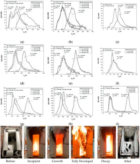 Experiment results of the heat release rate vs. ignition heat source for 0.33, 0.25, and 0.2 of the scale factor with a volume fraction of 0.024, 0.05, 0.07, and 0.1. (a) Test#1–Test#3. Heat release rate vs. time (Sf = 0.2, VF = 0.024, Qig = 11.00 kW, 21.10 kW, 28.54 kW); (b) Test#4–Test#6. Heat release rate vs. time (Sf = 0.2, VF = 0.05, Qig = 10.00 kW, 15.47 kW, 23.05 kW); (c) Test#7, Test#9. Heat release rate vs. time (Sf = 0.2, VF = 0.07, Qig = 10.00 kW, 18.65 kW); (d) Test#10–Test#12. Heat release rate vs. time (Sf = 0.2, VF = 0.1, Qig = 10.00 kW, 15.45 kW, 19.92 kW); (e) Test#13–Test#15. Heat release rate vs. time (Sf = 0.25, VF = 0.024, Qig = 10.00 kW, 15.16 kW, 22.47 kW); (f) Test#17–Test#18. Heat release rate vs. time (Sf = 0.25, VF = 0.05, Qig = 16.18 kW, 22.25 kW); (g) Test#19–Test#21. Heat release rate vs. time (Sf = 0.25, VF = 0.07, Qig = 10.00 kW, 15.77 kW, 21.36 kW); (h) Test#22–Test#24. Heat release rate vs. time (Sf = 0.25, VF = 0.1, Qig = 10.00 kW, 15.95 kW, 22.03 kW); and (i) Test#28–Test#30. Heat release rate vs. time (Sf = 0.33, VF = 0.05, Qig = 11.00 kW, 16.50 kW, 21.69 kW).