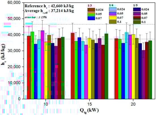 where Δhc,eff and Δmf are the effective heat of combustion and the mass loss of the pipe insulation after combustion, respectively. The measured effective heat of combustion for Sf = 1/3, 1/4, and 1/5, VF = 0.024, 0.05, 0.07, and 0.1 in accordance with the values of Qig are plotted in Figure 7. As shown in the figure, the average values of the effective heat of combustion was around 37,214 kJ/kg, which was only about 87% of the combustion efficiency compared to 42,660 kJ/kg. The main reason can be found that the incomplete combustion condition occurs due to the circumstance lack of ventilation regarding to the size of the opening area [,,,]. In addition, from R. N. Walters et al. [], the combustion heat value could be changed by the composition ratio and the porosity of the molecule consisted of materials. Therefore, the correlation between the geometric shape of the pipe insulation and the thermochemical properties of the molecular structure of the pipe insulation should be analyzed with the combustion efficiency to obtain more accuracy reasons. However, the main purpose of this study was to predict the fire growth rate index related with the scale factor (Sf), the volume fraction (VF), and the ignition heat source (Qig). Therefore, Qmax and tmax were analyzed with the effective heat of combustion assumed to be the averaged value of 37,214 kJ/kg.