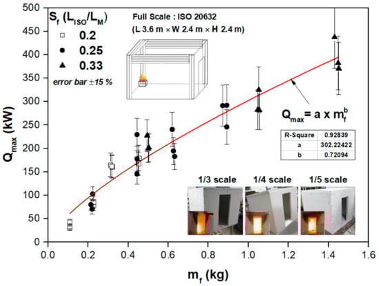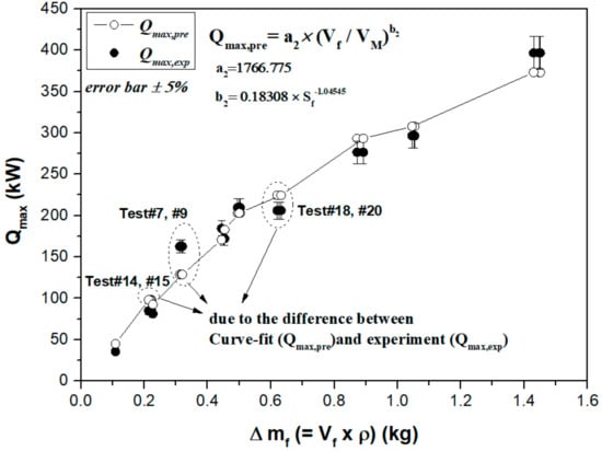 The predictions of Qmax and Δmf for the fixed values of the scale factor (Sf = 1/3, 1/4, and 1/5) and the volume fraction (VF = 0.024, 0.05, 0.07, and 0.1) were compared with the experiments as shown in Figure 10. The predictions at Δmf = 0.2 kg and 0.7 kg were higher about 15% than the experiments for Test #14, #15, and #18 in Table 4 due to the relatively high deviation of the averaged Qmax. On the other hand, the predictions at Δmf = 0.2 kg were about 15% lower than the experiments for Test#7 and #9 in Table 4. The main reason would be expected to take place from the combustion efficiency in accordance with the opening area []. However, it is confirmed that the total of 27 experiments and the predicted values were in good agreement within ±5%. Thus, Equation (12) indicates that the improved accuracy approximately 10% or more compared to Equation (11) since Sf and VF were considered. The limitation of the prediction should consider the experiment constants. The prediction of Qmax can be applicable in the case of establishing the database of various types of insulation.