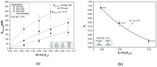 Figure 9a shows the correlations between Qmax and VF for Sf = 1/3, 1/4, and 1/5. As shown in the figure, Qmax intends to increase in proportional to VF as denoted in Equation (12).