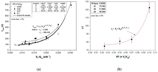 Figure 11a shows the relations between Sf/Qig and tmax in the case of VF = 0.024, 0.05, 0.07, and 0.1. The values of tmax, which was inversely proportional to Qig and proportional to Sf under the fixed value of VF, can be curve-fitted as,