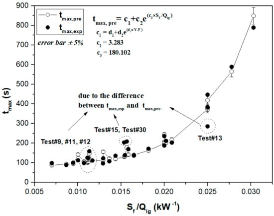 The predictions of tmax and Sf/Qig for the fixed values of the scale factor (Sf = 1/3, 1/4, and 1/5) and the volume fraction (VF = 0.024, 0.05, 0.07, and 0.1) were compared with the experiments as shown in Figure 12. The predictions at Sf/Qig = 0.01, 0.015, and 0.024 kW−1 were about 20% deviation than the experiments for Test #5, #6, #11, #12, #13, #15, and #30 in Table 4 due to the heat loss by the leakage from the connection part in the compartment, the difference humidity or the relatively low surrounding temperature. The heat loss can cause the experiments of tmax that could be relatively delayed than the predictions of tmax. However, the total 23 of predictions were in good agreement with the experiments in the error range of ±5%. Therefore, as mentioned in Section 3.3, tmax can be applicable in the case of establishing the database of various types of insulation. As denoted in Equations (12) and (16), the predictions of Qmax and tmax were significantly correlated with Sf, VF, and Qig, which were the test conditions of fire resistance standard. It is noticeable that the values of FIGRA can be obtained without experiments for the polyethylene foam pipe insulation if the effects of the thermal properties of the compartment materials are determined.