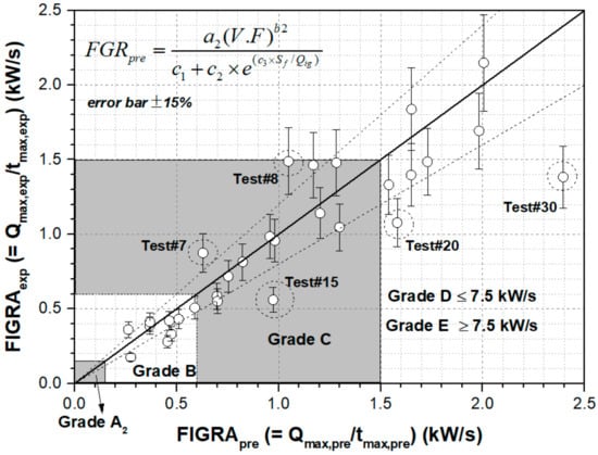Figure 13 shows the results of the comparisons between the predictions by Equation (18) and the experiments in Table 4. The predictions of Qmax for Test #15, #20, and #30 in Table 4 were about 11% higher than the experiments, while the predictions of tmax were about 16% lower than the experiments at FIGRA = 0.975 kW/s, 1.58 kW/s, and 2.40 kW/s. On the other hand, the predictions of Qmax for Test #7 and #8 in Table 4 were about 19% lower than the experiments, while the predictions of tmax were about 10% lower than the experiments at FIGRA = 0.63 kW/s and 1.05 kW/s. These results caused more than a 30% deviation of FIGRApre and FIGRA. It would be necessary to investigate the combustion efficiency and the surrounding temperature with environmental conditions to improve more accurate predictions. However, the final results shows that a total of 22 of the predictions were in good agreement with the experiments within ±15% since the predicted values of Qmax and tmax were satisfied with the experiments on the effects of Sf, VF, and Qig within ±5%. Especially, in the case of application of FIGRA of EN 13501-1, the polyethylene foam pipe insulation could have Grade B, C, or D in accordance with Sf, VF, and Qig.