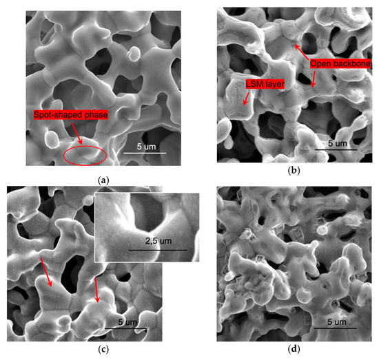 The comparison of images obtained before (Figure 1a,b) and after the electrochemical testing (Figure 1c,d) shows that the porosity of structures was not affected by testing. By contrast, transformations were evident at the surface of both electrodes after the electrochemical investigation. On the surface of the blank BSCF electrode, a dot-shaped minor phase appeared (Figure 1c); likewise, in previous findings [31], it was supposed that this phase could result from the aggregation, during testing time between 475 and 650 °C, of the distributed phase already present on the BSCF starting electrode surface (Figure 1a, red arrow and oval). Concerning the infiltrated electrode, the LSM was distributed as a continuous and homogeneous layer at the beginning (Figure 1b), while, after the testing, several extended defects with sharp edges and micropores appeared (Figure 1d).