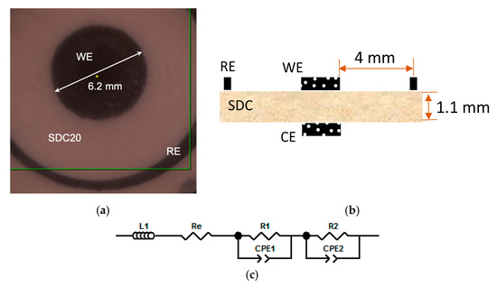 Figure 3 reports an optical image (Figure 3a) of the partial side of SDC electrolyte with the slurry-coated WE (in the center) and RE (ring-shaped), while the geometry features of the three-electrode configuration are reported in Figure 3b, following the indications of [32,33], as aforementioned. The measurements were performed using an RE in order to have accurate control of the WE potential, especially when an overpotential was applied.