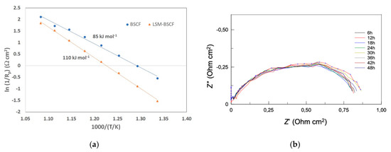 In Figure 5, the inverse of polarisation resistance (1/Rp) is reported as a function of temperature. An Arrhenius-like behaviour allowed for obtaining the values of apparent activation energy (Ea) for both the systems: 85.3 and 110.6 kJ mol−1 for blank BSCF and LSM-BSCF, respectively. These activation energy values concern the activity during the dynamic equilibrium state at OCV. It has been proven in the literature that LSM activity drops under anodic conditions [37], and, actually, the impedance spectra extracted under anodic overpotential conditions confirm that the presence of the LSM hinders the activity of the electrode (see Figure 4c,d). Despite this detrimental effct due to LSM, the increase in the catalytic activity of the BSCF was confirmed when a net anodic current flowed through the cell. As observable in Figure 4d, the LSM hindering effect was not able to counterbalance the enhanced activity of BSCF. Moreover, the LSM-infiltrated layer resulted in a positive effect on the long-lasting performance of the SDC/LSM-BSCF system. In previous work, it was found that LSM contributed to maintaining the polarization stability of the BSCF electrode, likely because of a positive influence on the electrochemical potential gradient at the interface LSM/BSCF, with this stabilizing effect indeed also observed for LSCF-based and other electrodes [14,17].