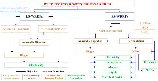 Over the past decade, distinct concepts have been proposed for the integration of the aforementioned technologies to design WRRFs. Proposed concepts can be clustered into two major groups based on the stream targeted for recovery: liquid stream and solids stream WRRFs. On one hand, solids stream WRRFs (SS-WRRFs) are closer in configuration to the existing CAS-WWTPs. In SS-WRRFs, the liquid stream is designed to densify the diluted COD concentration in the liquid stream and redirect it into the solids stream for recovery [6]. On the other hand, liquid stream WRRFs (LS-WRRFs) are built to recover COD directly within the liquid stream, while minimal sludge is produced and recovered within the solids stream [1]. Further classification for the proposed WRRFs can be carried out according to the carbon flow and key products and intermediates as shown in Figure 1. Noteworthy, a common feature in the WRRFs is that carbon recovery is no longer combined with nutrients recovery/removal [4].